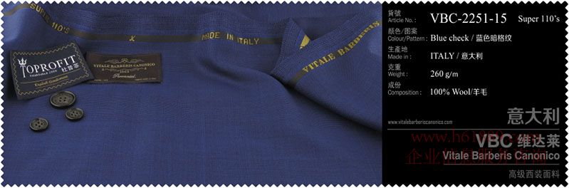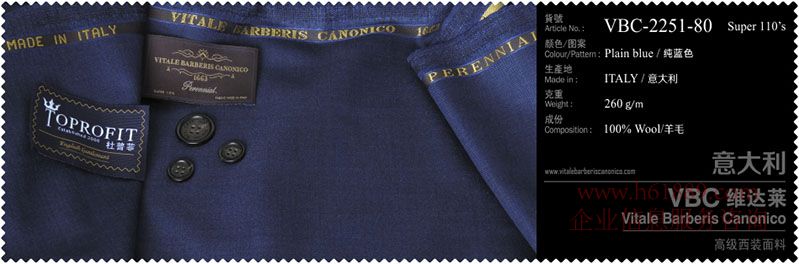 杜普菲:100%進(jìn)口面料、生產(chǎn)地:意大利、顏色圖案:純藍(lán)色、成份:100%羊毛、VBC維達(dá)菜:高級(jí)西裝面料
