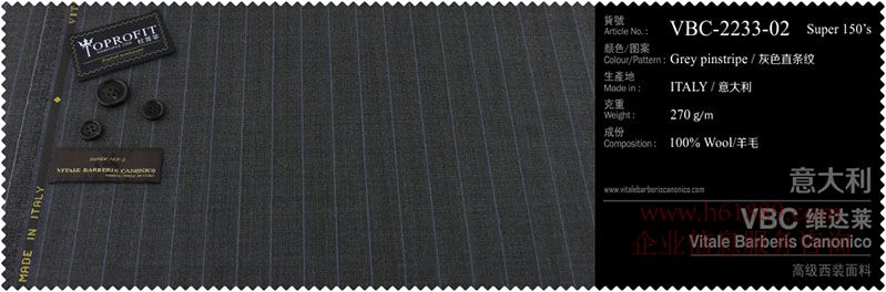 杜普菲:100%進(jìn)口面料、生產(chǎn)地:意大利、顏色圖案:灰色直條紋、成份:100%羊毛、VBC維達(dá)菜:高級(jí)西裝面料