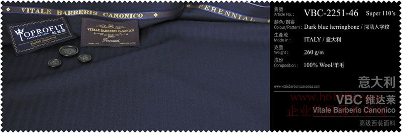 杜普菲:100%進(jìn)口面料、生產(chǎn)地:意大利、顏色圖案:深藍(lán)人字紋、成份:100%羊毛、VBC維達(dá)菜:高級(jí)西裝面料