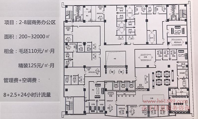 2-8樓辦公:毛坯98元/m2實(shí)收、豪華裝修115元/m2實(shí)收