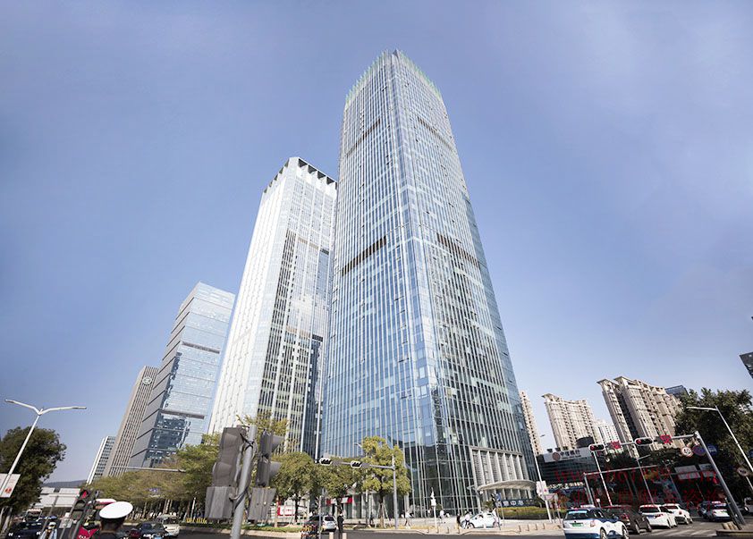 幕墻超大幅面單元式玻璃幕墻、結(jié)合樓體弧形立面、開闊視野更有保證、外部玻璃翼貫穿193米整體樓高、縱向線條間距產(chǎn)生疏密變化、呈現(xiàn)出獨(dú)特永恒美感、成為中心北區(qū)矚目焦點(diǎn)、雙層中空LOW-E玻璃、隔熱、防噪音、防輻射、透光等性能更佳