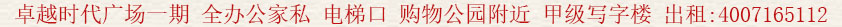 如果這個(gè)房您不滿意、我們還有卓越時(shí)代廣場寫字樓、租售面積:106平米、145平米、166平米、215平米、237平米、278平米、312平米、366平米、380平米、430平米、465平米、507平米、638平米、688平米、968平米、1775平米、標(biāo)準(zhǔn)層面積:1900平方米(辦公樓) 、面積任意組合積可供您選擇、租賃均價(jià):159元/平米/月起、本公司不收任何費(fèi)用