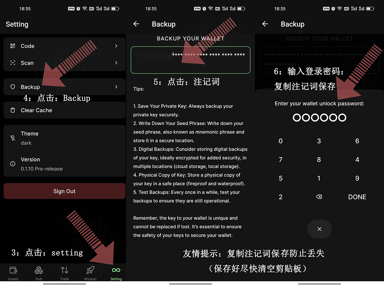 6:輸入登錄密碼:復(fù)制注記詞:保存防止丟失(保存好盡快清空剪貼板)