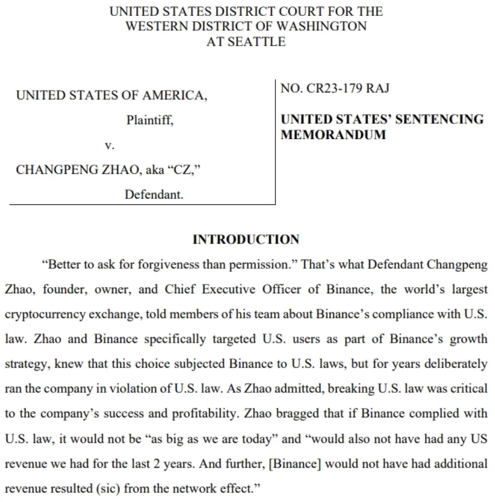 美國(guó)司法部在當(dāng)?shù)貢r(shí)間周二提交的量刑備忘錄中顯示:幣安創(chuàng)始人趙長(zhǎng)鵬(CZ)在2023年11月承認(rèn)違反《銀行保密法》后,應(yīng)該判處36個(gè)月(3年)監(jiān)禁,并支付5000萬(wàn)美元罰款