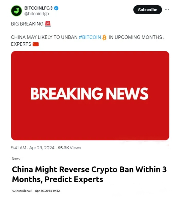 加密貨幣媒體:CoinPedia、知名加密社群BitcoinLFG透露,以對(duì)加密貨幣采取強(qiáng)硬立場(chǎng)而聞名的中國,似乎很快就會(huì)重新考慮對(duì)比特幣的禁令