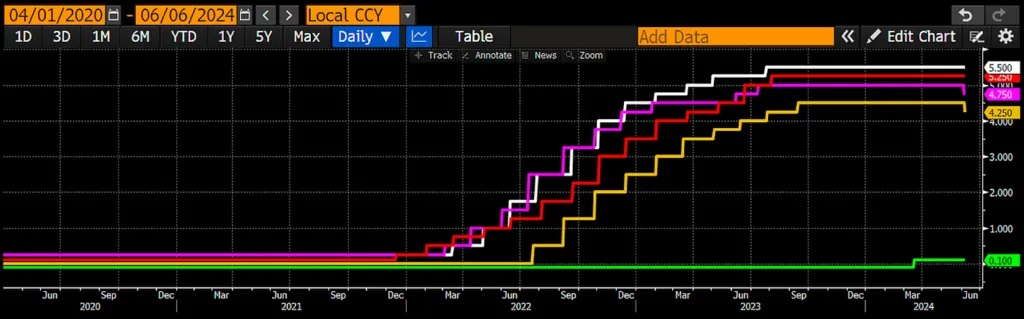2024年6月7日:加拿大央行宣布將基準(zhǔn)利率從 5% 下調(diào)至 4.75%,這是今年以來加拿大央行第二次降息