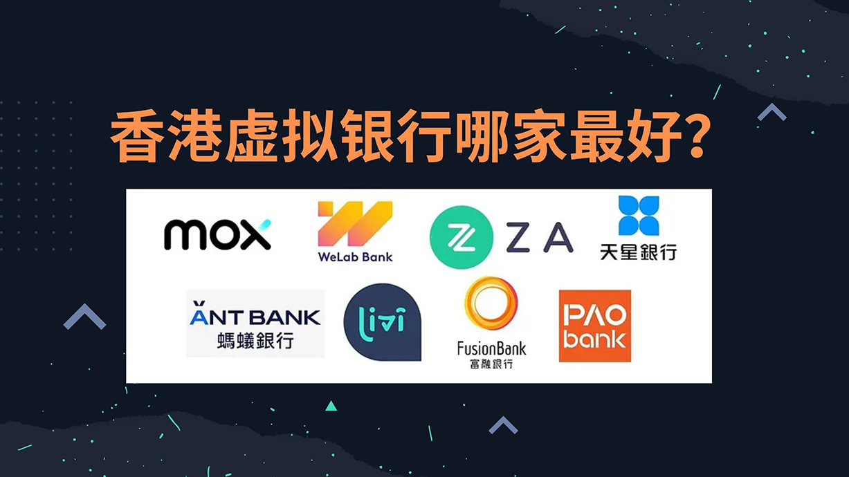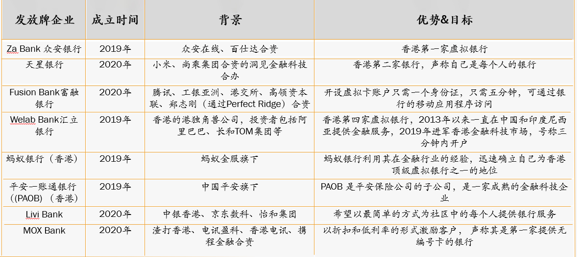 眾安銀行 ZA Bank、利維銀行、匯立銀行 Welab Bank、天星銀行 Airstar Bank、螞蟻銀行Ant Bank、富融銀行 Fusion Bank、平安壹賬通銀行 PAO Bank