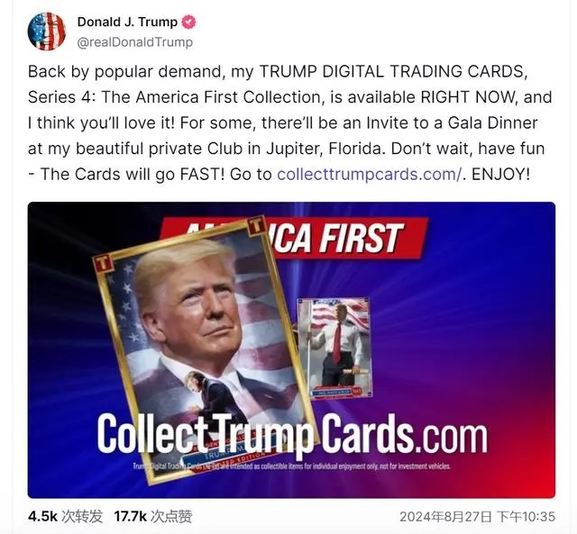 特朗普宣布這一消息的前一天,他還推出了新一批以自己形象為主題的NFT交易卡,并公開(kāi)發(fā)售