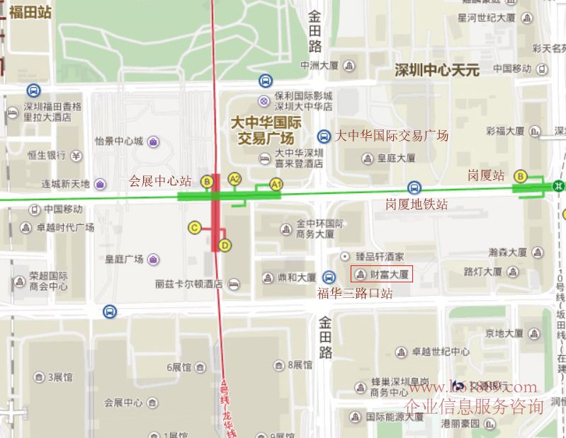 東面:瀚森大廈、兆邦基金融大廈、崗廈地鐵站、南面:卓越世紀(jì)中心、國際能源大廈、西面:金中環(huán)商務(wù)大廈、鼎和大廈、北面:現(xiàn)代國際大廈、皇庭中心、中洲大廈。財(cái)富大廈(時(shí)代財(cái)富大廈)樓下就是:福華三路口公交站、會(huì)展中心地鐵站步行幾分鐘路程