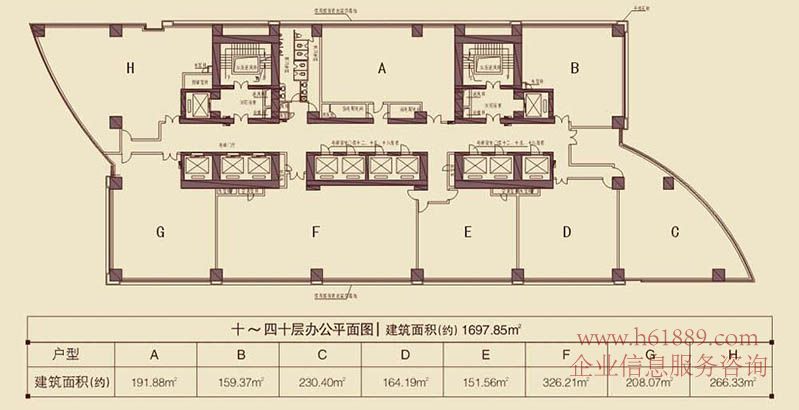 租售面積:191平米、230平米、266平米、326平米、315平米、376、570平米、703平米、821平米、1500平米、整層面積約:1697平米、面積任意組合