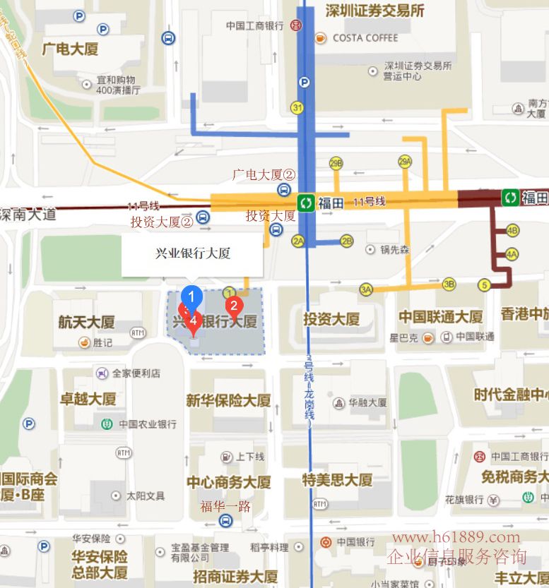 興業(yè)銀行大廈【福建興業(yè)銀行大廈】位于深圳CBD中心區(qū)的腹地:它地處深圳的脊梁——深南大道的南側(cè),位于地鐵二、三、十一號(hào)線的樞紐福田站不到五十米的西南面、辦公環(huán)境好、而橫過(guò)深南大道,那就是深圳華爾街;東面就是廣深港高速鐵路深圳的總站—福田地下火車站、由興業(yè)大廈步行到地下火車站也僅僅才一百多米而已