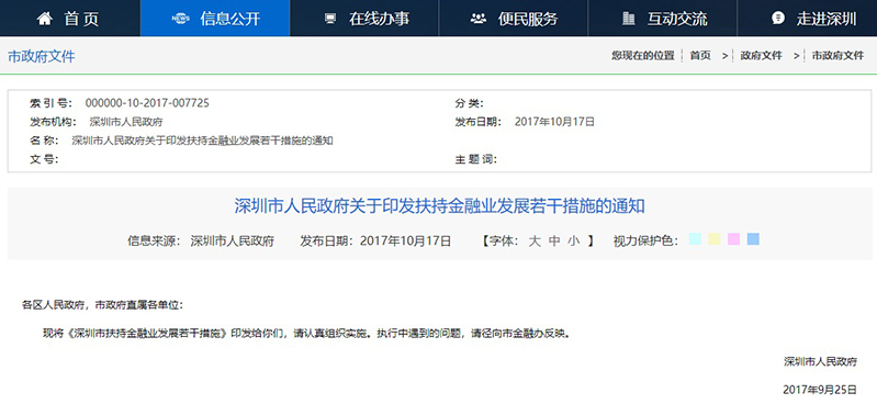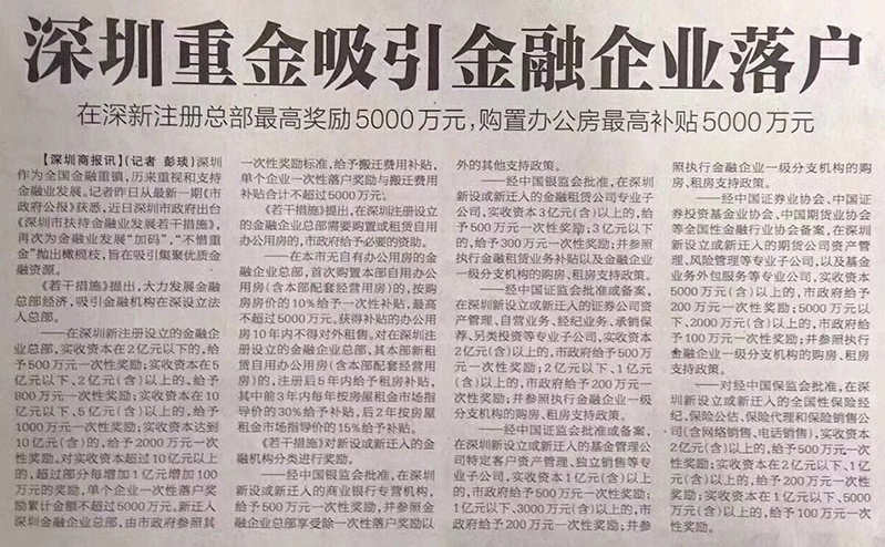 2017年10月18日,深圳市政府在《市政府公報》公布了關(guān)于《深圳市扶持金融業(yè)發(fā)展若干措施》,市政府“不惜重金”吸引金融企業(yè)落戶深圳,在深圳新注冊總部最高獎勵5000萬元!購置辦公住房最高補(bǔ)貼5000萬元!