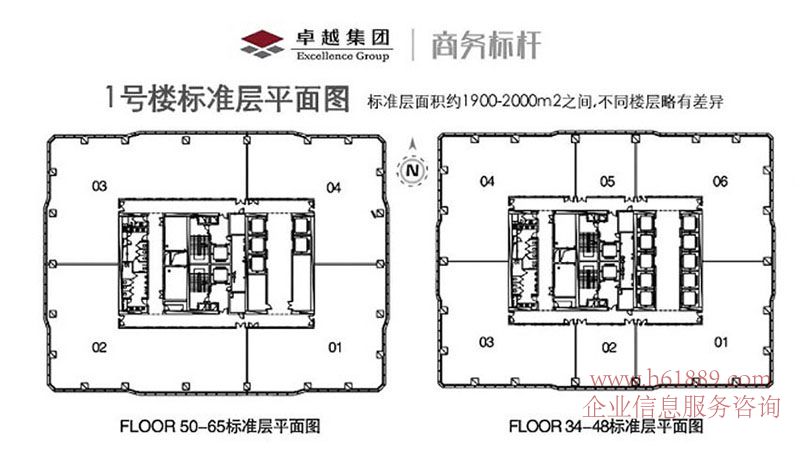 卓越世紀中心1號樓租售中心 卓越世紀中心1號樓簡介 卓越世紀中心1號樓 34到48層 50到65層 標準層平面圖