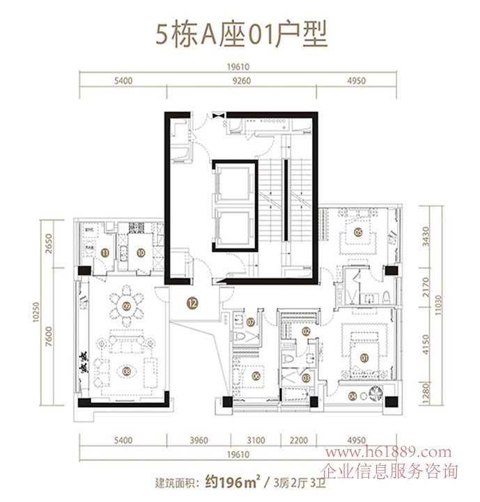深圳中心?天元?5棟 A座01戶型 約:196平米 3房2廳3衛(wèi) 戶型圖片