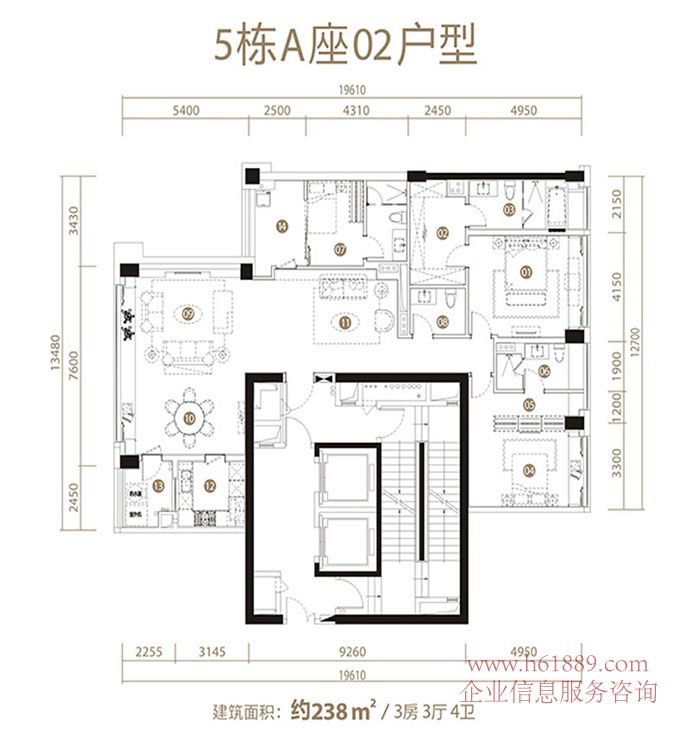 深圳中心?天元?5棟 A座02戶型 約:238平米 3房3廳4衛(wèi) 戶型圖片