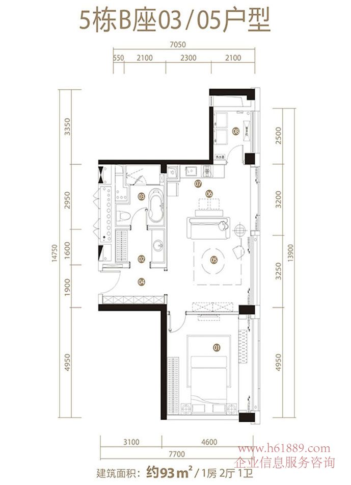 深圳中心?天元?5棟 B座03/05戶型 約:93平米 1房2廳1衛(wèi) 戶型圖片