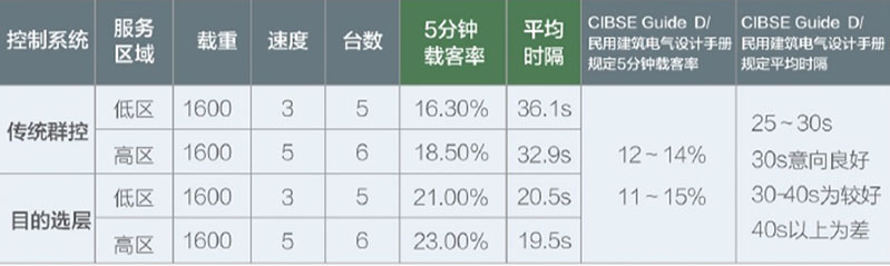 選用目的選層系統(tǒng)后5分鐘載客率≥14%、平均等候時(shí)間≤20秒、超過甲級(jí)寫字樓優(yōu)秀水平【CIBSE Guide D 5分鐘載客率≥12%、平均等候時(shí)間≤30秒】