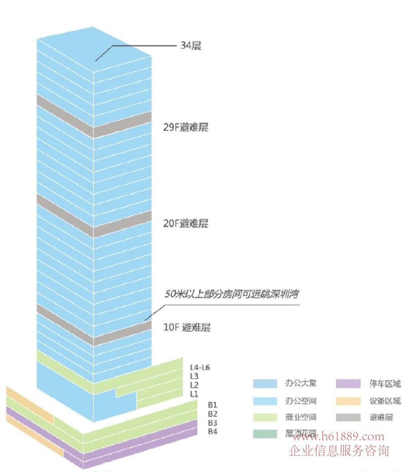 建筑功能樓層分布:●L1-L4商業(yè)、●L5-L34辦公、●B2-B1商業(yè)、●B4-B3停車場(chǎng)