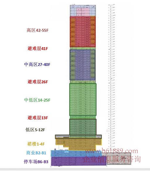 深地鐵置業(yè)大廈:高區(qū)平面圖、42F到55F中高區(qū)、每兩層一個(gè)中庭、西是單層、東是雙層、建筑面積:1906平米(無中庭)、1996平米(有中庭)、高區(qū):6部電梯、中區(qū):6部電梯