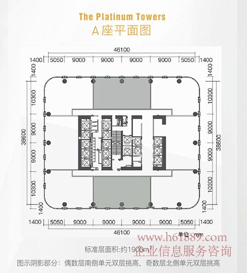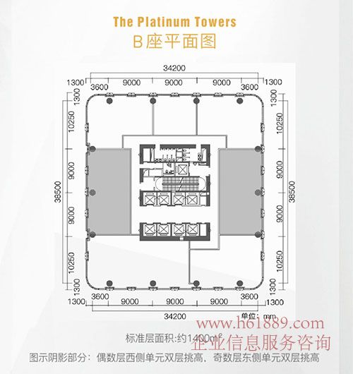 博今國際(博今商務(wù)廣場)A座平面圖、標(biāo)準(zhǔn)層面積約:1900平米、圖示陰影部分:偶數(shù)層南側(cè)單元雙層挑高、奇數(shù)層北側(cè)單元雙層挑高
