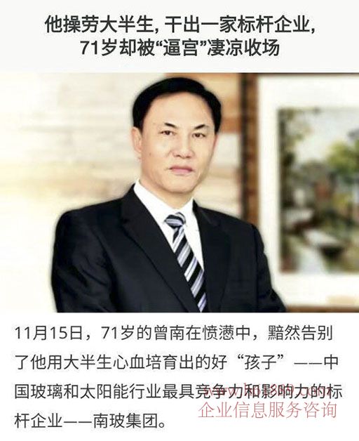 2016年11月15日,曾南在憤懣中告別了他用大半生心血培育出的好“孩子”——中國玻璃和太陽能行業(yè)最具競爭力和影響力的標(biāo)桿企業(yè)——南玻集團(tuán)。