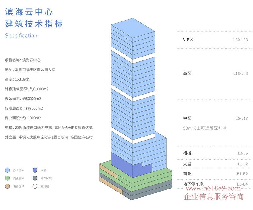 樓層布局:負(fù)3樓至負(fù)4樓停車場,負(fù)2樓至5樓為商業(yè)配套,6樓至33樓為寫字樓辦公區(qū)域,10/20/29樓為避難層,其中1樓大堂-8-9樓為福田政企綜合服務(wù)廳,企業(yè)足不出戶就能享受一站式服務(wù)!