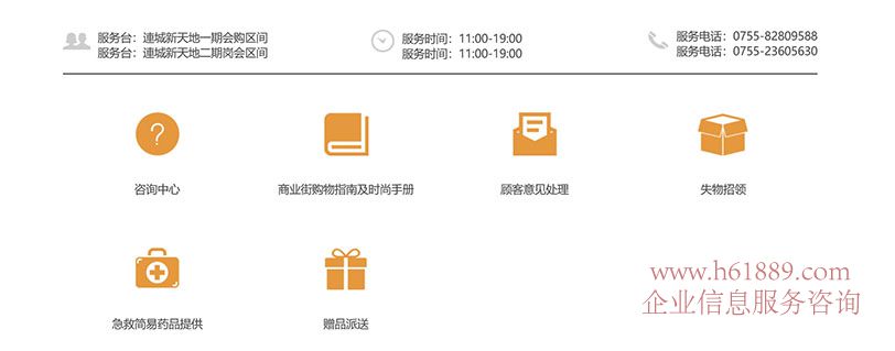 服務(wù)臺(tái):連城新天地 LINKCITY 一期會(huì)購(gòu)區(qū)間 服務(wù)時(shí)間:11:00到19:00 服務(wù)電話:0755-82809588