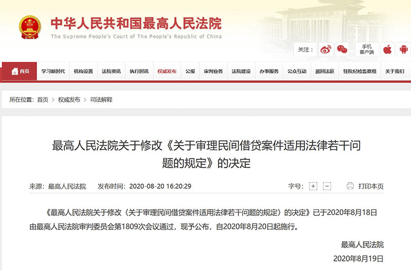 民間借貸的利率是民間借貸合同中的核心要素,也是當事人意思自治與國家干預(yù)的重要邊界。最高人民法院在認真聽取社會各界意見并征求金融監(jiān)管部門意見建議的基礎(chǔ)上,經(jīng)院審判委員會討論后決定:以中國人民銀行授權(quán)全國銀行間同業(yè)拆借中心每月20日發(fā)布的一年期貸款市場報價利率(LPR)的4倍為標準確定民間借貸利率的司法保護上限,取代原《規(guī)定》中“以24%和36%為基準的兩線三區(qū)”的規(guī)定,大幅度降低民間借貸利率的司法保護上限,促進民間借貸利率逐步與我國經(jīng)濟社會發(fā)展的實際水平相適應(yīng)。以2020年7月20日發(fā)布的一年期貸款市場報價利率 3.85%的4倍計算為例,民間借貸利率的司法保護上限為15.4%,相較于過去的24%和36%有較大幅度的下降。