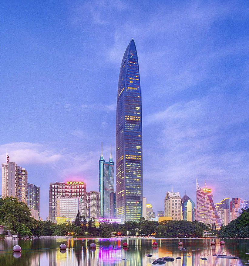位于項目南面的是京基100大廈,總建面 22 萬平方米,其中包括 17.5 萬平米國際級甲級寫字樓、 4.6 萬平米的鉑金五星級酒店;整棟樓共 100 層,高度為 441.8 米 ,外觀簡潔、流暢,彷如傾瀉于城市之中的瀑布,建成后將成為深圳目前最高的一座地標性建筑,全國第三、全球第 8 高的摩天地標。在外觀幕墻的設計上,大樓采用的是,目前世界上最先進的單元式玻璃幕墻與環(huán)保高性能超白雙銀 LOW — E 中空玻璃,具有隔音、隔熱、節(jié)能、防輻射、光透度好等優(yōu)點。