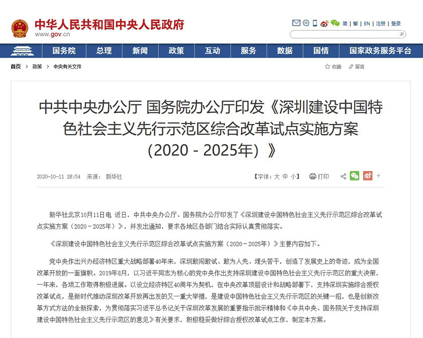 據(jù)2020年10月11日央視網(wǎng)新聞聯(lián)播:近日,中共中央辦公廳、國務(wù)院辦公廳印發(fā)了《深圳建設(shè)中國特色社會主義先行示范區(qū)綜合改革試點實施方案(2020—2025年)》,并發(fā)出通知,要求各地區(qū)各部門結(jié)合實際認真貫徹落實