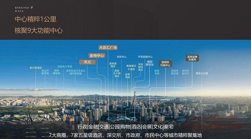 私募證券大廈【大百匯廣場】中心精粹1公里、核聚9大功能中心(行政、金融、交通、公園、購物、酒店、會展、文化、豪宅)7大商圈、7家五星級酒店、深交所、市民中心等城市精粹聚集地