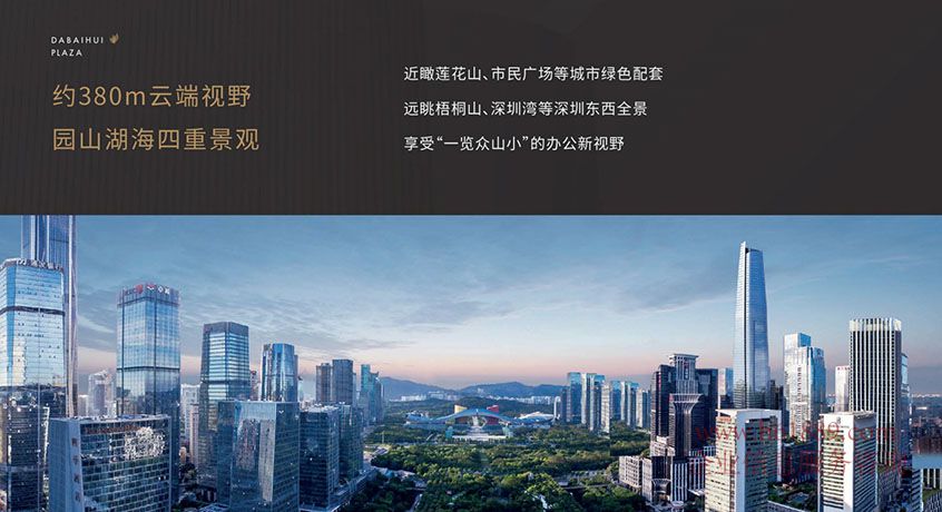 私募證券大廈【大百匯廣場】約380米云端視野、園山湖海四重景觀、近瞰蓮花山、市民廣場等城市綠色配套、遠眺梧桐山、深圳灣等深圳東全景、享受、一覽眾山小、的辦公新視野