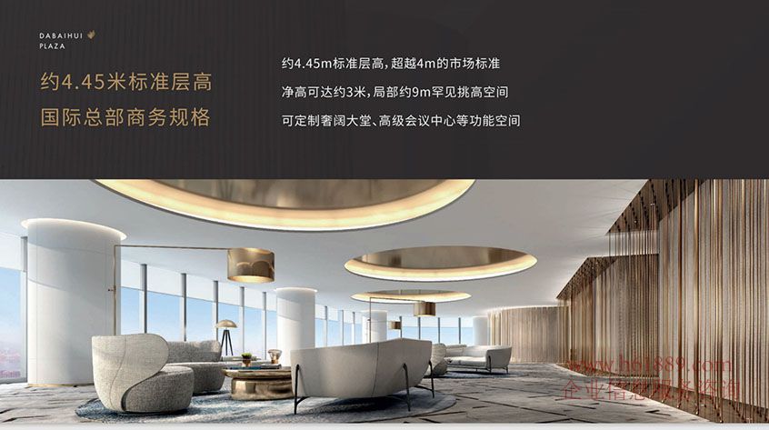 約4.45米標準層高、國際總部商務規(guī)格、約4.45米標準層高、超越4米的市場標準、凈高可達約3米、局部約9米罕見挑高空間、可定制奢闊大堂、高級會議中心等功能空間