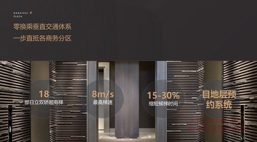 零換乘垂直交通體系、一步直低各商務分區(qū)、18部日立雙轎廂電梯、8m/s最高梯速、縮短侯梯時間:15到30%