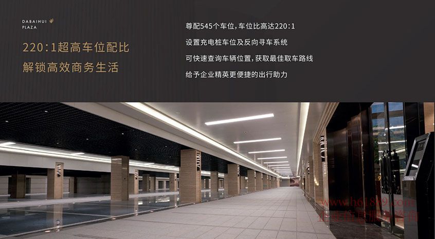 私募證券大廈【大百匯廣場】220:1超高車位配比、解鎖高效商務生活、尊配545個車位、車位比高達220:1、設置充電樁車位及反向尋車系統、可快速查詢車輛位置、獲取最佳取車路線、給予企業(yè)精英更便捷的出行助力
