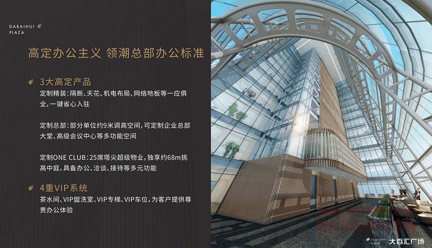 私募證券大廈【大百匯廣場】高定辦公主義、領潮總部辦公標準、3大高定產品、定制精裝:隔斷、天花、機電布局、網絡地板等一應俱全、一鍵省心入駐、定制總部:部分單位約9米調高空間、可定制企業(yè)總部大堂、高級會議中心等多功能空間、定制ONE、CLUB:25席塔尖超級物業(yè)、獨享約68m挑高中庭、具備辦公、洽談、接待等多元功能、4重VIP系統、茶水間、VIP盟洗室、VIP專梯、VIP車位、為客戶提供尊貴辦公體驗