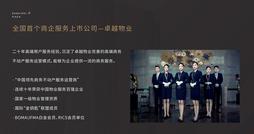 二十年高端用戶服務經驗、沉淀了卓越物業(yè)完善的高端商務、不動產服務運營模式、能夠為企業(yè)提供一流的商務服務、“中國領先商務不動產服務運營商”連續(xù)十年榮獲中國物業(yè)服務百強企業(yè)、國家一級物業(yè)管理資質、國際“金鑰匙”聯盟成員、BOMA\IFMA白金會員、RICS會員單位