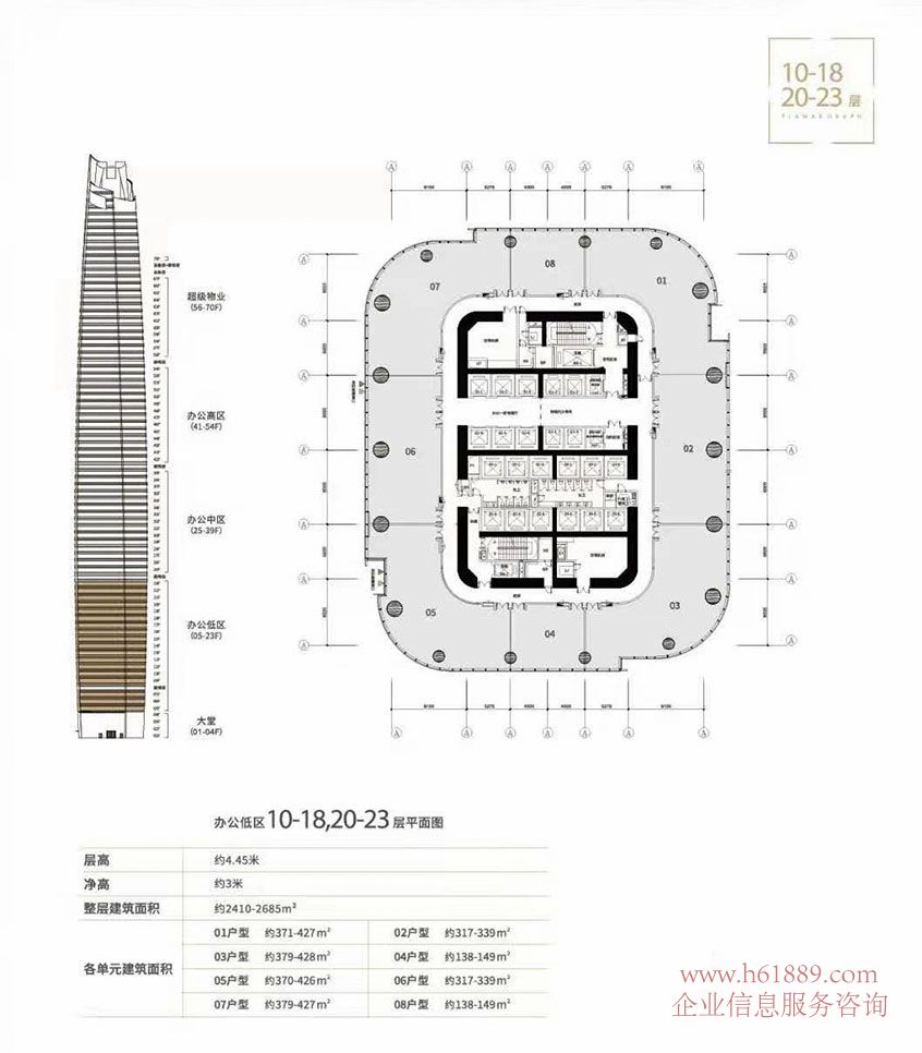 私募證券大廈【大百匯廣場】正式啟動: 出租 出售 私募證券大廈【大百匯廣場】、辦公低區(qū) 10到18層、20到23層平面圖、層高約:4.45米、凈高約3米、整層建筑面積約:2410平米到2685平米、各單元建筑面積: