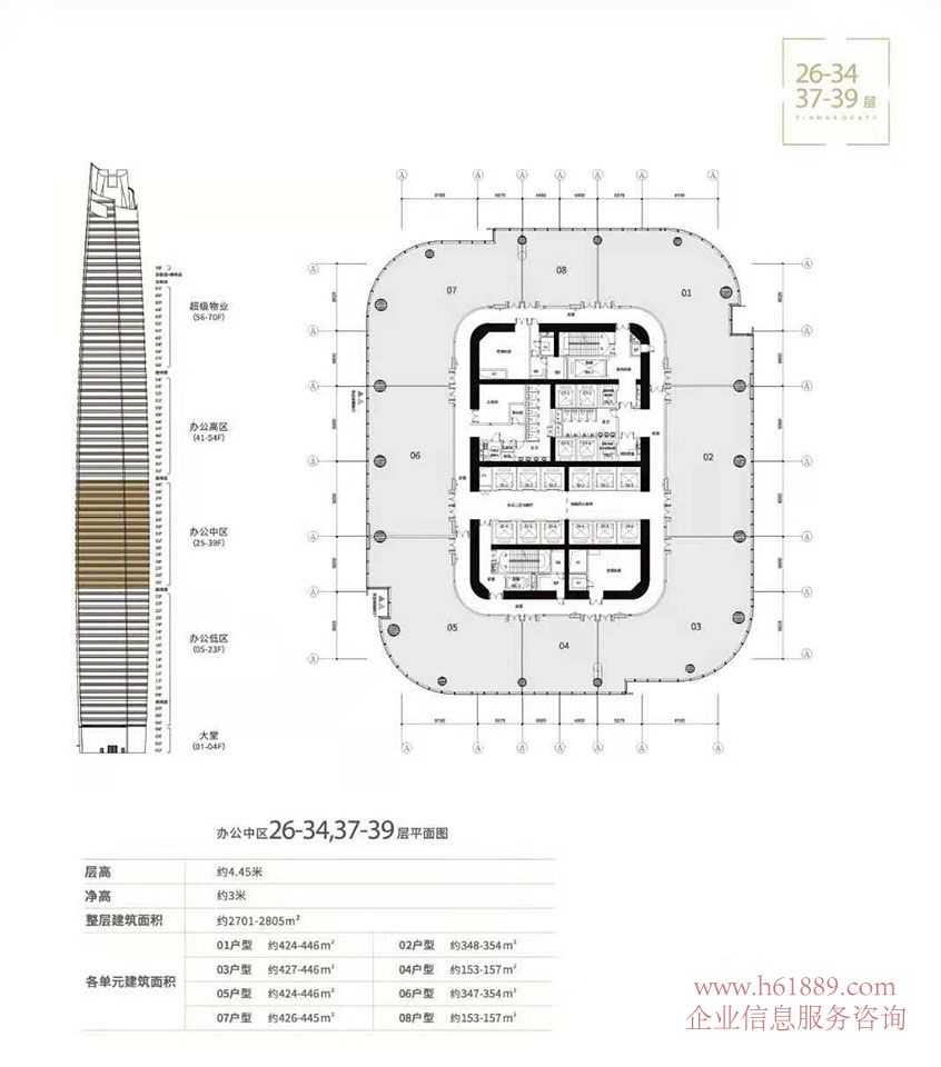 私募證券大廈【大百匯廣場】正式啟動:出租 出售 私募證券大廈【大百匯廣場】辦公中區(qū) 26到34層、37到39層平面圖、層高約:4.45米、凈高約3米、整層建筑面積約:2701平米到2805平米、各單元建筑面積: