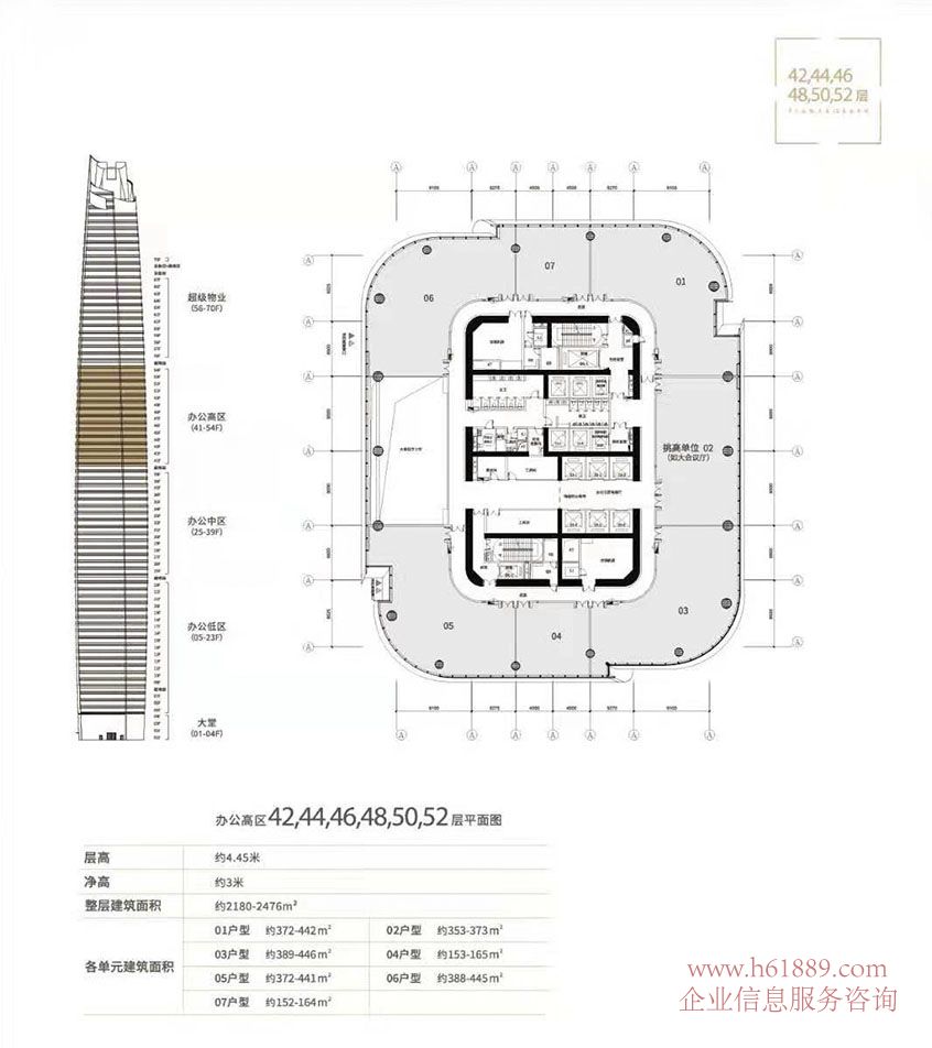 私募證券大廈【大百匯廣場】正式啟動:出租 出售 私募證券大廈【大百匯廣場】辦公高區(qū) 42層、44層、46層、48層、50層、52層平面圖、層高約:4.45米、凈高約3米、整層建筑面積約:2180平米到2476平米、各單元建筑面積: