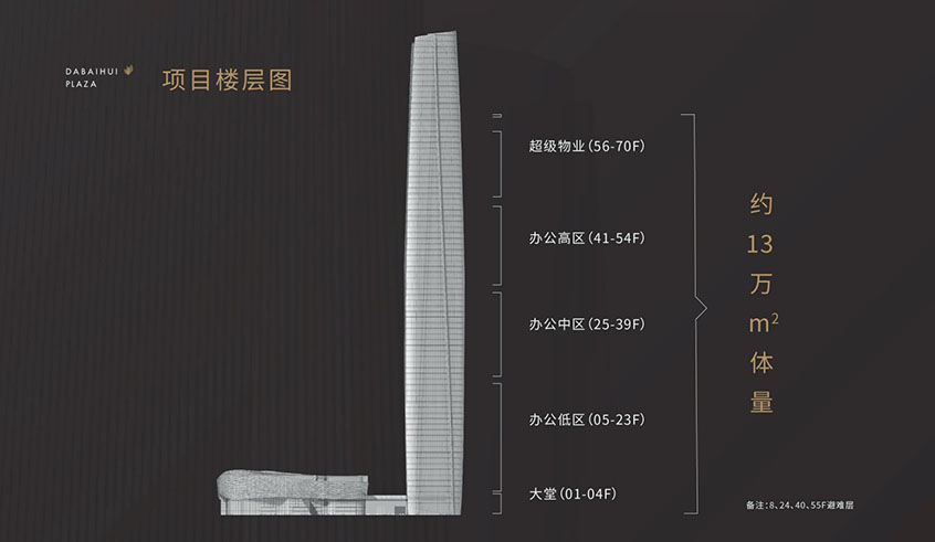 私募證券大廈【大百匯廣場】項目樓層:大堂(01到04F)、辦公低區(qū)(05到23F)、辦公中區(qū)(25到39F)、辦公高區(qū)(41到54F)、超級物業(yè)(56到70層)備注:8層、24層、40層、55F避難層