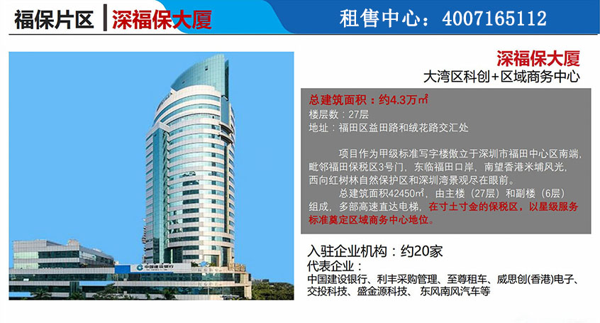二:深福保大廈、項目基礎信息 深福保大廈近福田保稅科技產業(yè)區(qū),由深福保國資委集團開發(fā),是福田區(qū)中心南端唯一甲級寫字樓。依托臨港的區(qū)位優(yōu)勢和先行先試的體制機制優(yōu)勢,入駐企業(yè)未來將享受國家對外開放窗口的政策紅利,是福田區(qū)發(fā)展趨勢突出和極具競爭力的辦公產品。 目前入駐企業(yè)有臺灣世平集團、神達電腦公司,歐姆龍公司(OMRON)、東電化公司(TDK)、西華貿易公司以及中國建設銀行、民潤超市等