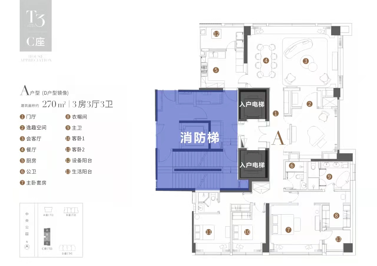 深圳中心天元 T3棟 C座 A戶型(D戶型鏡像)建筑面積約:270平米 3房3廳3衛(wèi) 戶型圖片