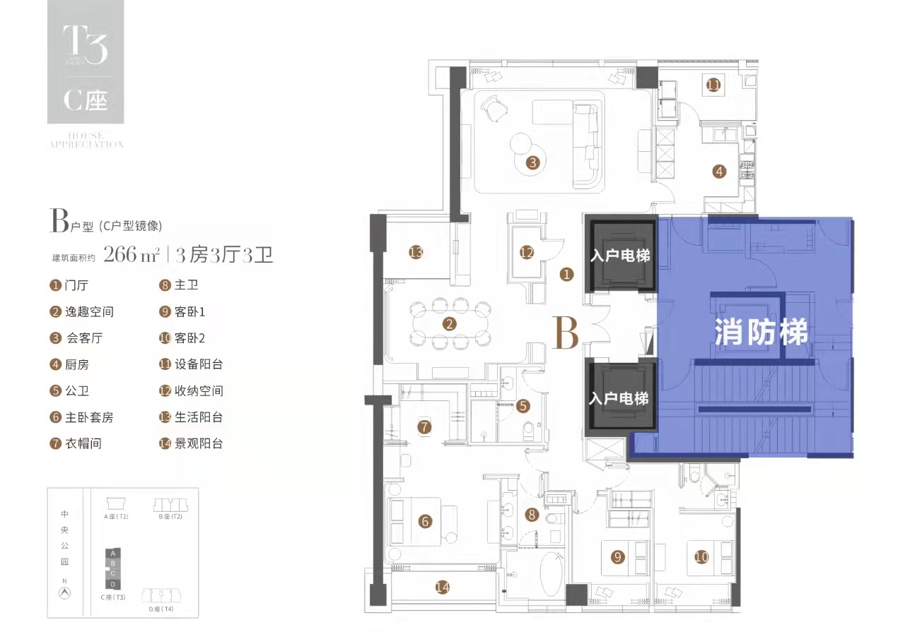 深圳中心天元 T3棟 C座 B戶型(C戶型鏡像)建筑面積約:266平米 3房3廳3衛(wèi) 戶型圖片