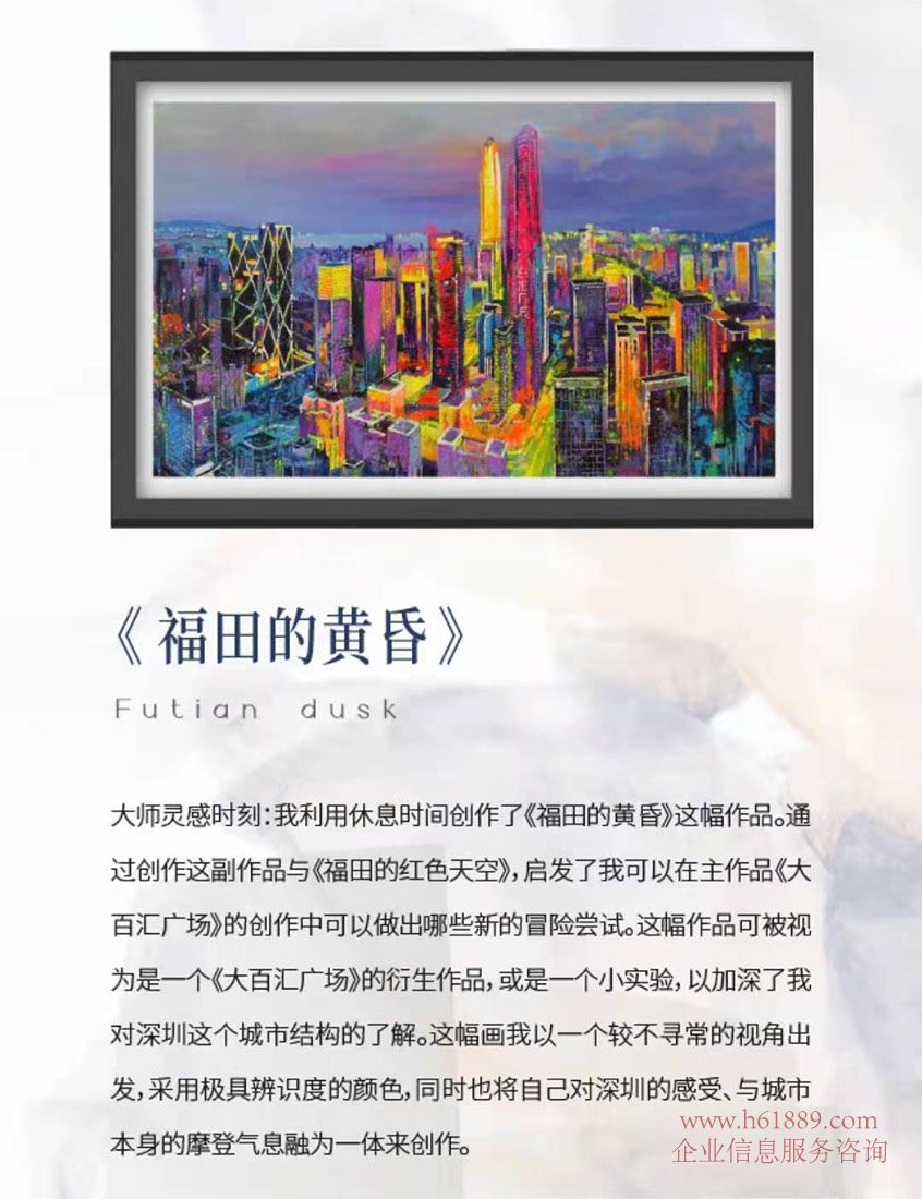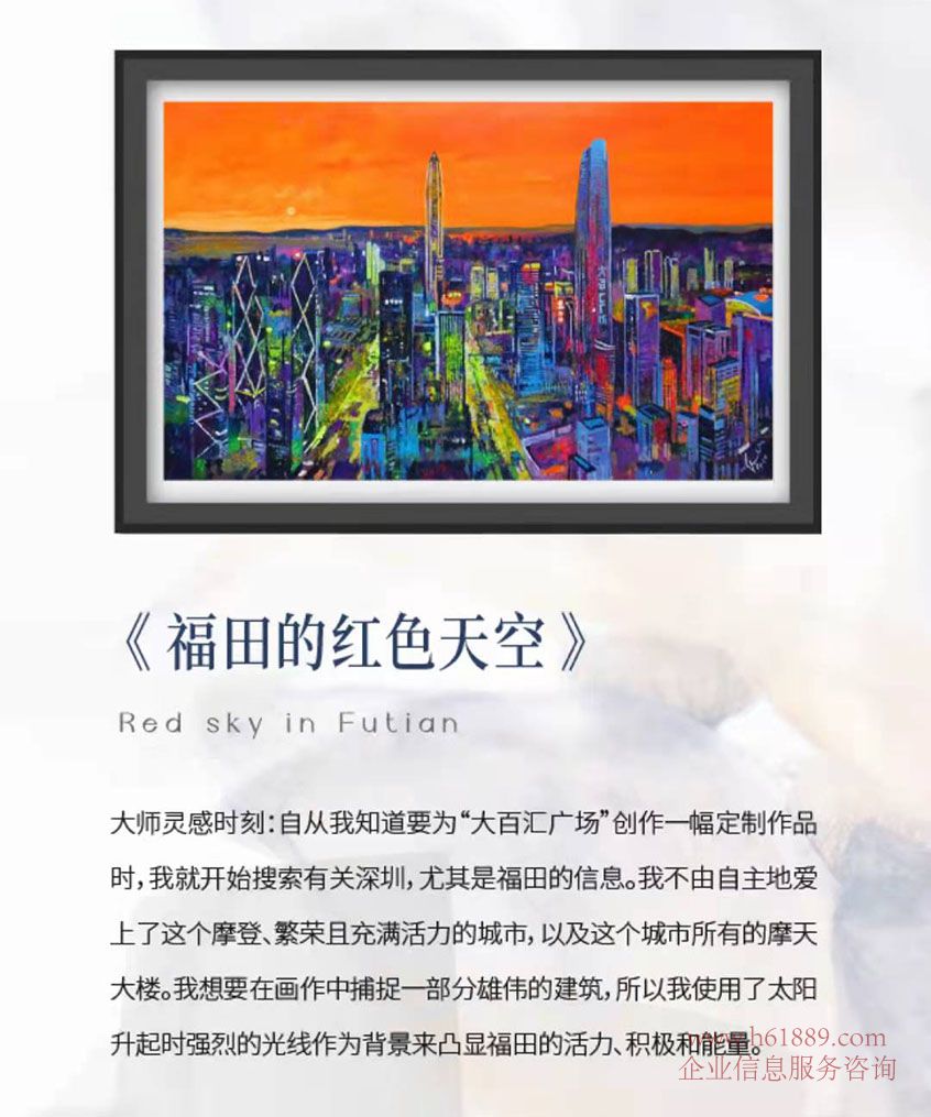 以全新的表現(xiàn)方式呈現(xiàn)出建筑的世界、以文化藝術(shù)對(duì)話建筑藝術(shù)、此次畫展中,共有3幅深圳城市畫作入選烏皮安諾“世界城市”系列,即《深圳?大百匯廣場(chǎng)》、《福田的黃昏》、《福田的紅色天空》。以福田區(qū)天際地標(biāo)——大百匯廣場(chǎng)、平安金融中心為主體,從城市中軸的獨(dú)特視角出發(fā),采用極具辨識(shí)度的顏色,將作者對(duì)深圳的感受與城市本身的摩登氣息融為一體。