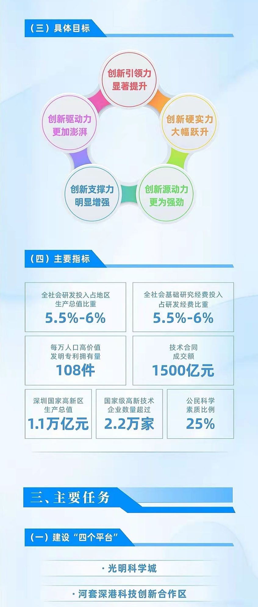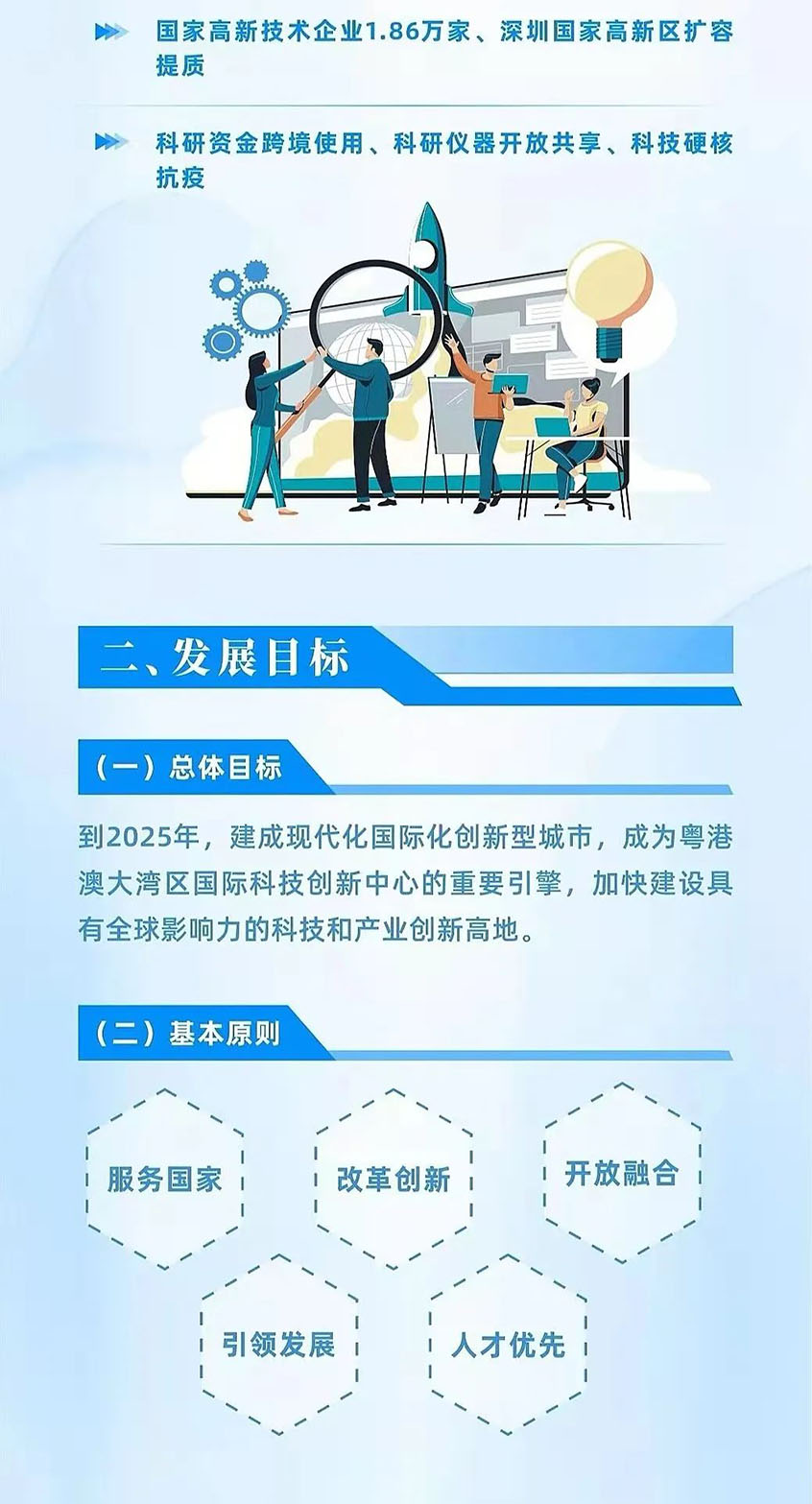 《規(guī)劃》提出發(fā)展目標:到2025年,深圳將建成現(xiàn)代化國際化創(chuàng)新型城市,成為粵港澳大灣區(qū)國際科技創(chuàng)新中心的重要引擎,加快建設具有全球影響力的科技和產(chǎn)業(yè)創(chuàng)新高地。