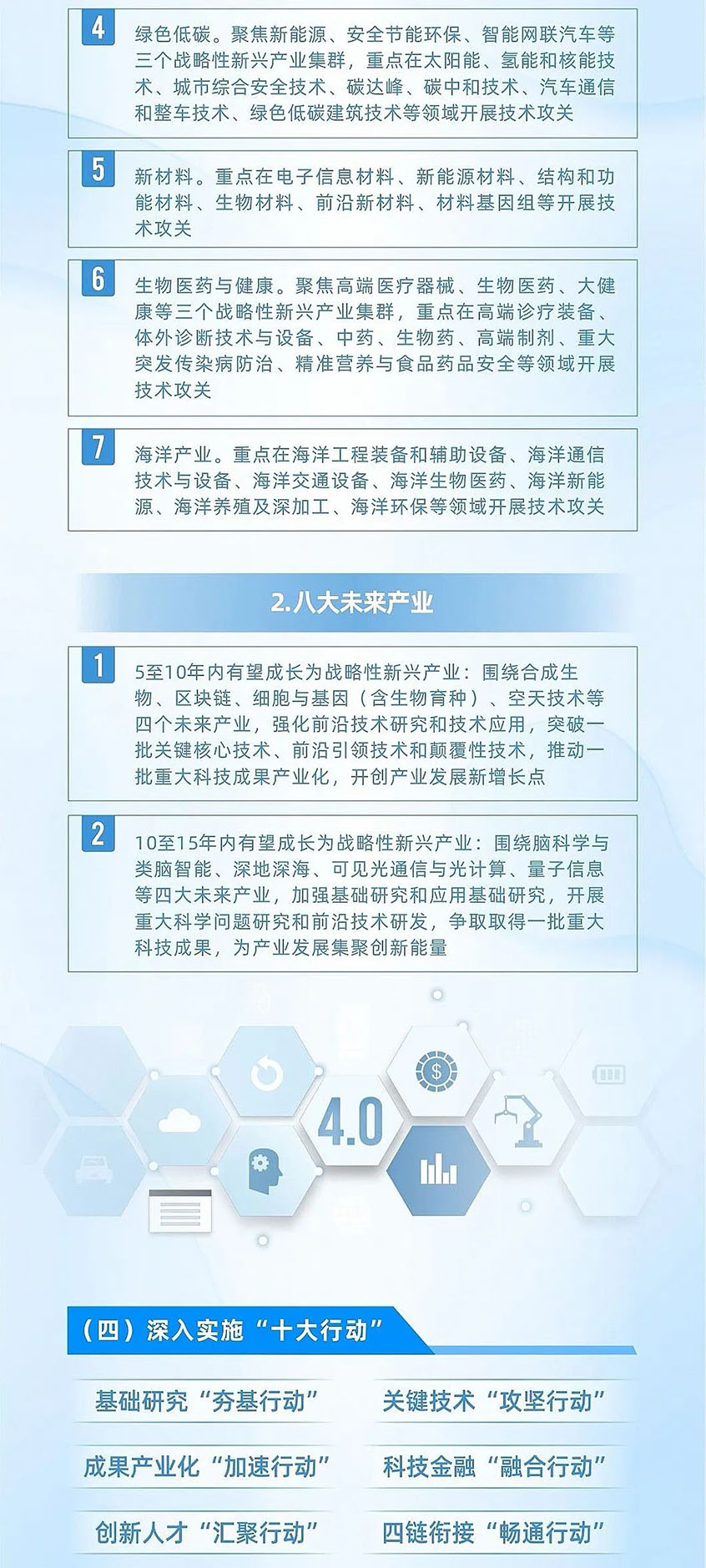 實施“十大行動”:包括基礎研究"夯基行動"、關鍵技術"攻堅行動"、成果產(chǎn)業(yè)化"加速行動"、科技金融"融合行動"、創(chuàng)新人才"匯聚行動"、四鏈銜接"暢通行動、開放創(chuàng)新"拓展行動"、科學文化"厚植行動"、改革創(chuàng)新"深化行動"、法治建設"保障行動"