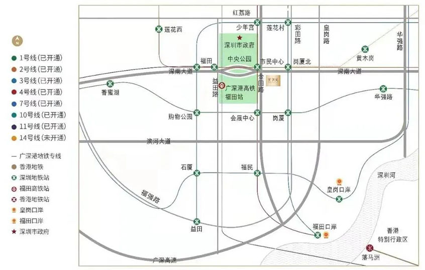 項(xiàng)目西側(cè)不到1000米,是亞洲最大的地下高鐵站“福田站”。通過福田站向南14分鐘就可以到達(dá)香港西九龍,向北則可以連通全國(guó)主要城市;項(xiàng)目直線距離2.5公里內(nèi),有皇崗、福田兩大“一類口岸”連通香港