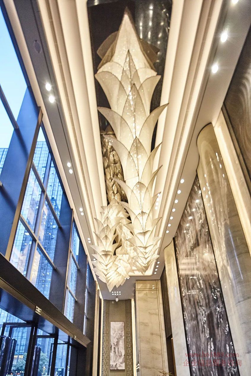 項(xiàng)目采用雙首層大堂——首層入戶大堂凈高10米:北大堂藝術(shù)吊燈以“鳳凰”為主題,與南大堂的龍燈形成“龍鳳呈祥“的格局(下圖)