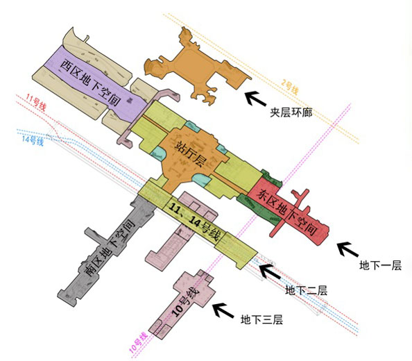 地鐵2號(hào)線(xiàn)、10號(hào)線(xiàn)和在建的14號(hào)線(xiàn)、11號(hào)線(xiàn)二期4條線(xiàn)路的換乘交通樞紐,也是國(guó)內(nèi)目前最大的軌道交通單體工程。